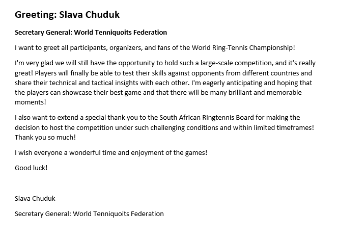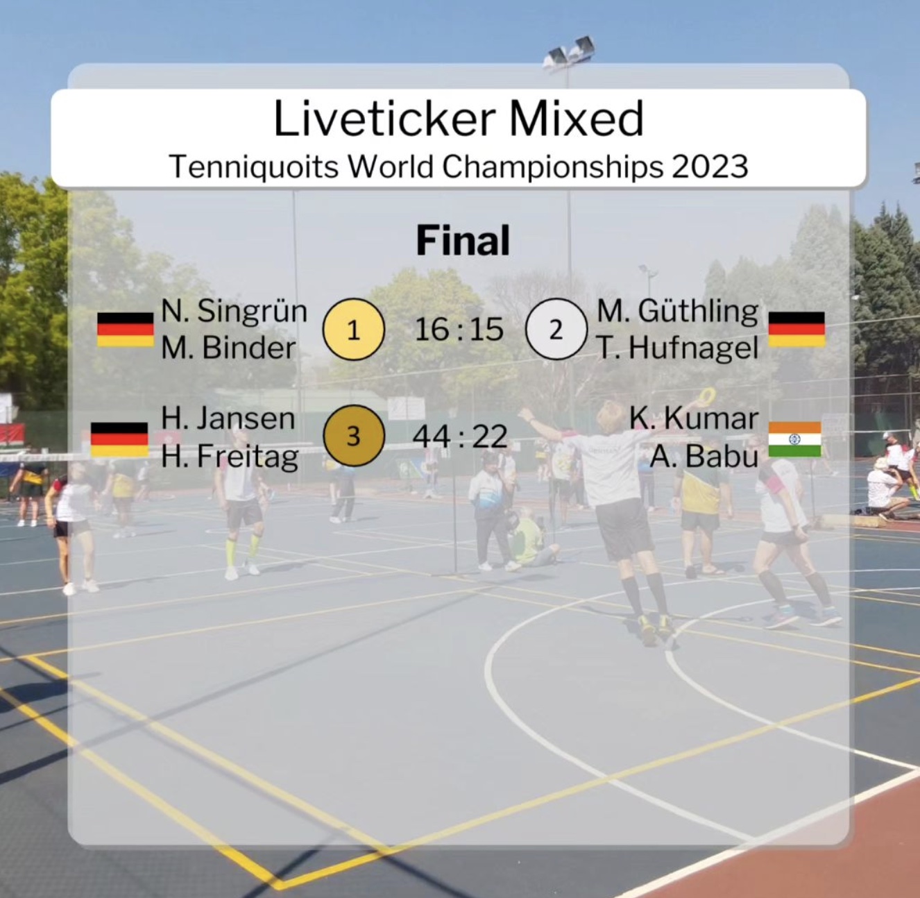 The first discipline was played out completely: In the "Mixed Doubles" N. Singrün and M. Binder (Germany) won in a very close match against M. Güthling and T. Hufnagel (Germany) the match for the first place with 16:15.